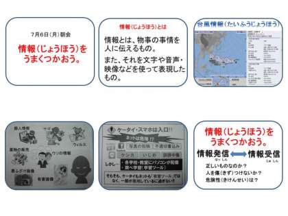 7月は6日(月)の朝会で情報に関する話をしました。先月末に参加した研修会で情報セキュリティの講演を聞きました。その時に児童・生徒の間でネットにからむ問題行動が発生しているという事例も出たので全体の場でも話題にし,再度クラスで指導を入れた方がいいと思ったからです。