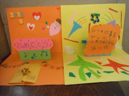 「おとうさん、お仕事がんばってくれてありがとう。」など,心温まるカードができ上がりました。