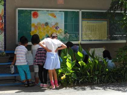校内に貼ってあるクイズの問題を解いたり,先生とジャンケンしたりして活動を楽しみました。