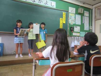 今日の5時間目は,3年生が国語科の「伝えよう,楽しい学校生活」の成果を発表しに,教室に来てくれました。桃山小学校の楽しい学校生活について紹介してくれました。3年生が写真や本を使って,わかりやすく説明してくれました。1年生から質問を受けると,3年生は堂々と答えていました。1年生は楽しい行事がたくさんあることを知って,嬉しそうにしていました。3年生のみなさん,ありがとうございました。