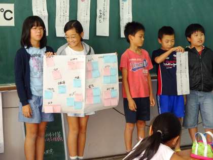夏休みに自分たちが取り組んだエコの活動を振り返り,今後の取り組むべき課題について考え,話し合い,グループで今後取り組もうと思うエコ活動について発表しました。