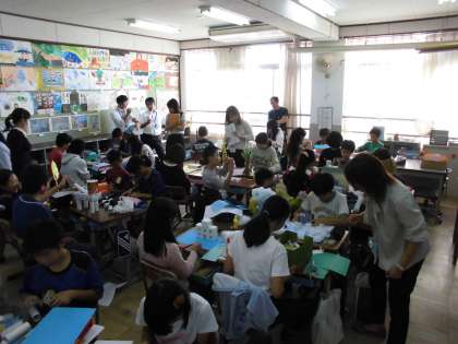図工では,「ドリームスクールプラン〜夢の学校を提案しよう〜」というテーマで各自が自分が構想した学校を楽しそうに工作していました。空き箱やペットボトルのキャップ,綿や色画用紙など,思い思いに材料を組み合わせて作品に仕上げていました。最後のふりかえりでは,二人の子が自分の作品と工夫した所をクラスのみんなに紹介しました。