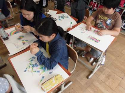 図画工作の授業では,「絵の具を使って」という学習をしています。円に色を塗り,それを扇形に切って画用紙に貼り,好きな模様を作ります。配置によってできる模様が違い,おもしろいです。個性豊かな作品が完成しました。