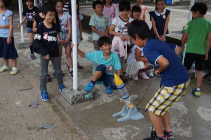 4年生が理科「とじこめた空気と水」の学習でペットボトルロケットを飛ばしました。ロケットを遠くまで飛ばすために水と空気の量をどれくらい入れたらいいかを考えて調整します。発射するたびに子ども達の大きな歓声が響いていました。