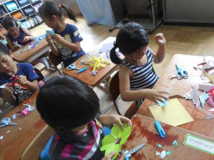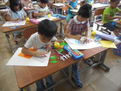 図工の学習では,折り紙に切り込みを入れて,思い思いに模様を作りました。 折り紙を幾重にも折ってから切り込みを入れると、規則的できれいな模様ができ,子ども達は喜びながら活動していました。