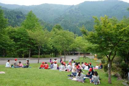 宿泊棟1棟に入室後,芝生広場へ出てお弁当の時間です。グループごとに芝生の上で持参したお弁当をおいしくいただきました。目の前の明日登る山を見て,「しんどそう!」というが声が聞こえました。