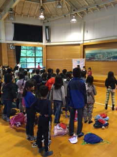 「みさきの家」に到着後,体育館で入所式を行いました。旗を上げた後,職員の方からお話を聞きました。