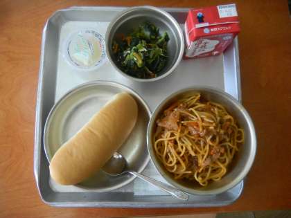 メニューは,小型コッペパン,スパゲティのミートソース煮,小松菜のソテー,牛乳そして,デザートにりんごゼリーがついています。