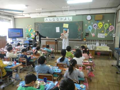栄養教諭の藤川が1年生の教室に入り,食べ方や片づけ方の指導をいたしました。