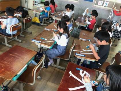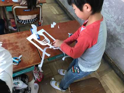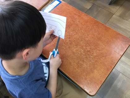 紙を切るときは紙をまわす,刃の奥で切るなどのことを一緒に確認し,安全に気を付けてチョキチョキ切りました。
