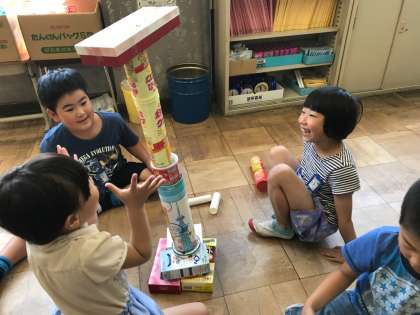 お家から持ってきてもらったたくさんの形の容器を使って,積みあげたり,組み合わせたりして「何に見えるかな?」と話し合いました。