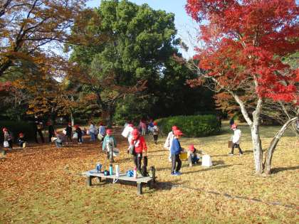赤・オレンジ・黄色のきれいな葉っぱや、いろんな形のどんぐりなどを見つけて喜ぶ様子が見られました。「コマがつくれそう」「この葉っぱ、黄色とオレンジがまざってきれい!」などたくさん秋を見つけていました。
