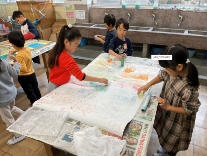 いろんな色のインクをスタンプみたいにぺったんと押したり、毛糸などをトイレットペーパーの芯などに巻付け、凹凸を付けてコロコロ転がしたりしました。