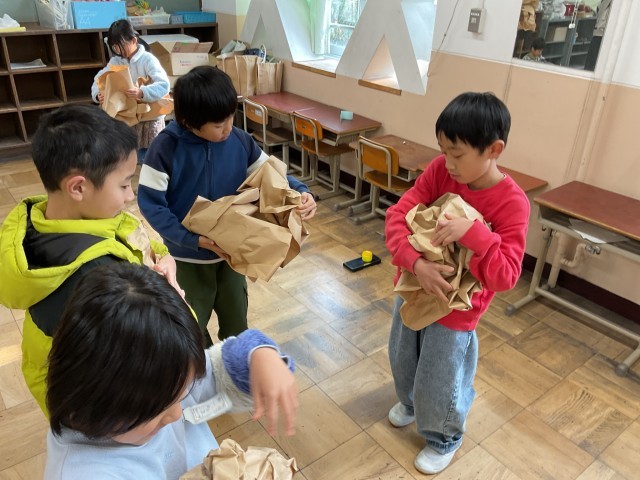 図画工作科『くしゃくしゃぎゅっ』の学習では、クラフト紙を袋の形にして新聞紙を詰めました。その袋を紐で縛って作品を作っています。「袋が魚に見えてきたよ!」「紐を長めにくくったよ。クラゲのあしみたいだよ。」と楽しい想像で作品作りをしています。来週は、飾りつけをしてもっと楽しい作品にしていきたいと思っています!できた作品は2月の校内図工展で展示予定です。楽しみにしていてください。