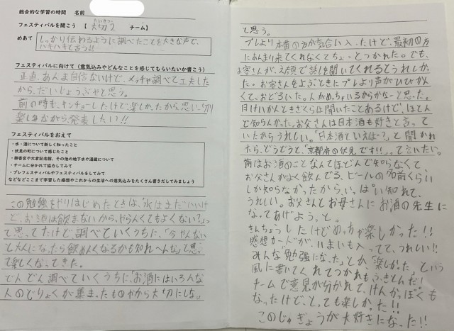 また、ここまでの学習の振り返りもしました。学習が始まったときから本番までの率直な思いや気持ちの変化など時間をたくさんかけて書きました。