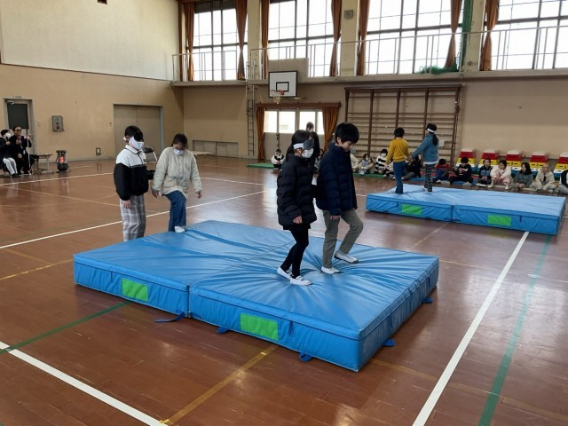 後半はアイマスクをつけた友だちを「手引き」する体験をしました。いつも通り歩くのではなく、曲がる時や止まる時、前方に障害物がある時に毎回声をかけながら歩く補助をしていました。