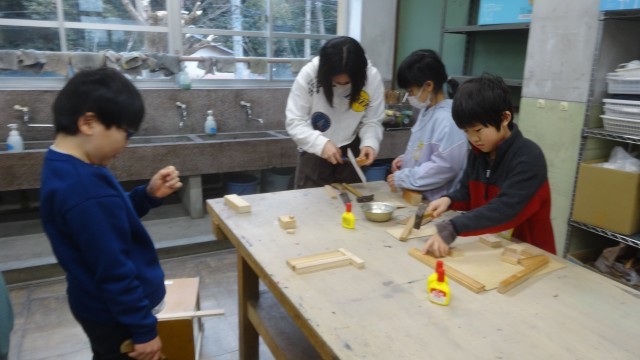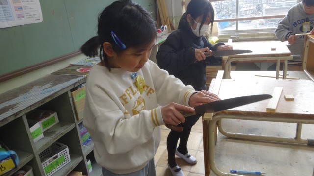 のこぎりの扱い方に慣れてくると、木材で「どんなことができるかな」と考えながら工作を楽しんでいました。