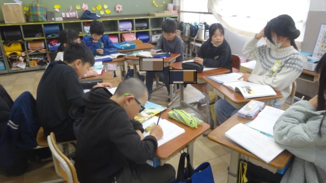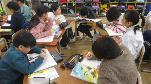 今回は、「歌は、原稿用紙に何を書こうとしていたのか」という問いに向かって自分たちで話し合いをすすめ、考えを深めていくことができたのですが、どのグループも新たな発見があり、とてもおもしろい「読み」ができています。話し合いの様子をみているだけで、自分の意見や思いも話したくなるようなグループ活動ができていることに、4年生の成長を感じた時間でした。