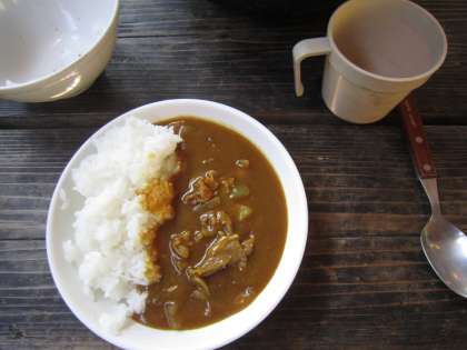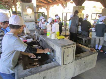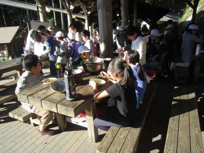 今日の夕食は,カレーライスです。野菜を切ったり,火をおこしたりと,みんなで協力して作りました。