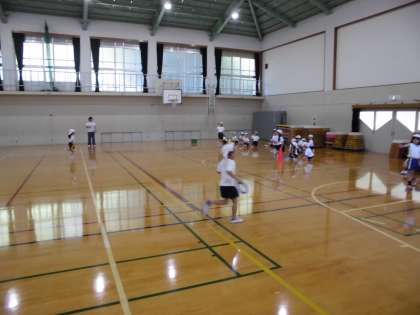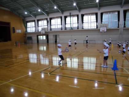 体育の時間に「リレー遊び」を学習しています。上手にリングを次の走者に渡していました。