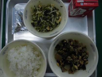 今日の給食の献立は「ご飯」「肉みそ炒め」「牛乳」「切干大根の煮付け」「じゃこ」です。