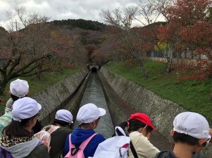 午後からは琵琶湖疏水沿いを歩き,峠を越えて滋賀県の浜大津まで抜けました。途中,疏水建設の際に作られた竪坑と呼ばれる縦型のトンネルや県境のトンネルを見学し,地域の発展につくした先人の知恵や苦労を学ぶことができました。