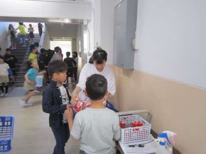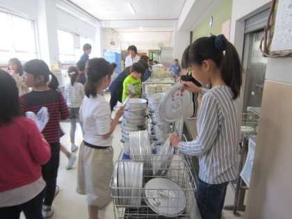給食が終わったら,後片付けです。給食室に食器や食缶などを返却しにやってきた給食当番を委員会の高学年が優しくサポートしてくれていました。