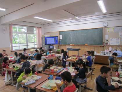 給食中の教室をのぞいてみると,みんな和やかな雰囲気で食べていました。食缶をのぞいてみると,完食!「ごちそうさま」の声も,元気に響いてきました。