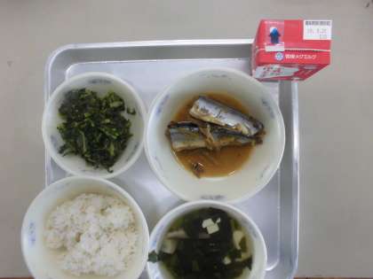 今日の給食の献立は,「麦ごはん」「すまし汁」「牛乳」「秋刀魚のかわり煮」「大根葉の炒め物」です。