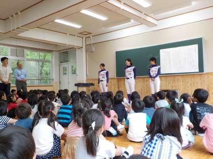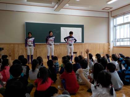 女子プロ野球リーグの「京都フローラ」というチームの選手が1年生に会いに来てくれました。