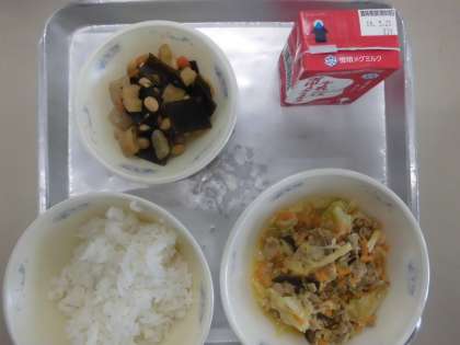 今日の給食の献立は,「ご飯」「豚肉とキャベツの味噌炒め」「牛乳」「ごもくに豆」です。