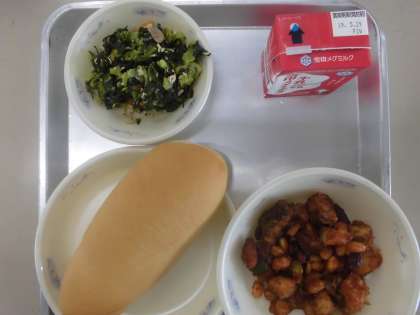 今日の給食の献立は,「コッペパン」「タラと豆のアングレス」「牛乳」「小松菜のソテー」です。