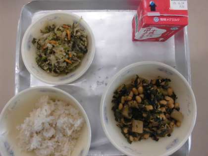 今日の給食の献立は,「麦ごはん」「肉味噌炒め」「牛乳」「切干大根の胡麻煮」です。
