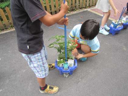2年生のトマト「りりこ」が大きくなってきました。早くも実がつきはじめた苗もあります。今日は,友達と協力し,支柱を立てました。色づきおいしいトマトが収穫できる日が楽しみです。