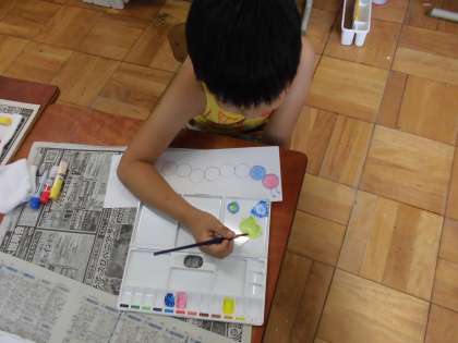 パレットや水入れの置く場所を確認し,道具の使い方を学習したあと,色塗りに挑戦しました。