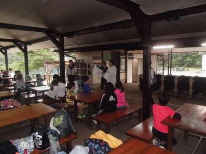 野外炊事の手順の説明を聞いています。