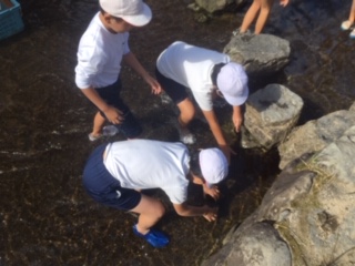 生き物の命にふれる学習として魚つかみに挑戦しています。