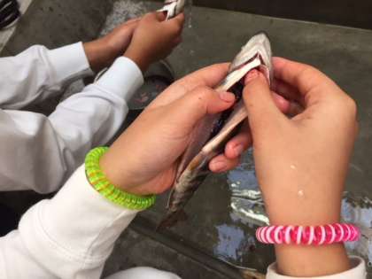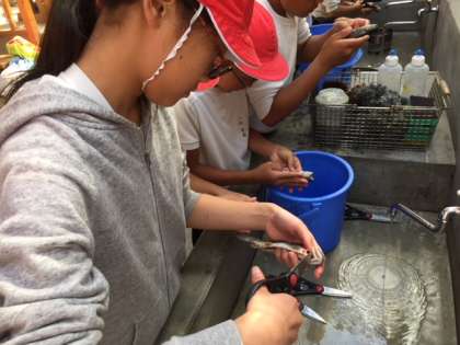 取った魚をこれからさばきます。「どうすんの?」と言いつつも、みんな真剣な表情でさばいています。