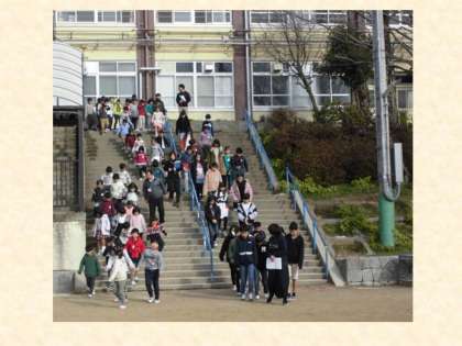 今日の訓練は,地震の想定で行いました。まず,自分の身を守る・安全が確認できたら運動場に避難するという訓練でした。