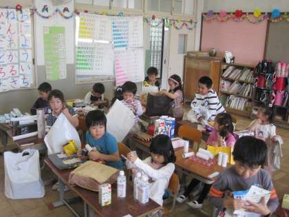 家庭から空き箱や空き缶を持ち寄って、立体について勉強しています。