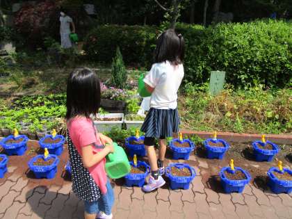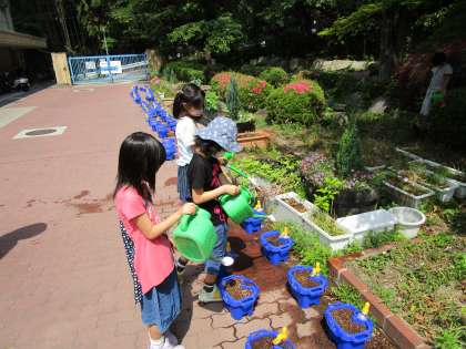 5組さんのお友達が,学校で育ててる植物に水やりをしてくれていました。気温が上がっていく中,汗だくになりながら一生懸命に水やりをしてくのできっと植物も喜んでいると思います。