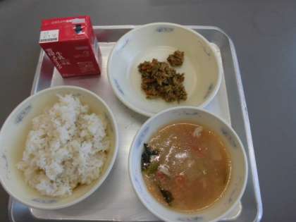 今日の献立は,麦ごはん ・牛乳・おからサバ丼・トマトだご汁