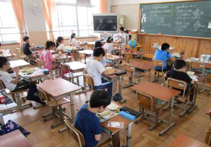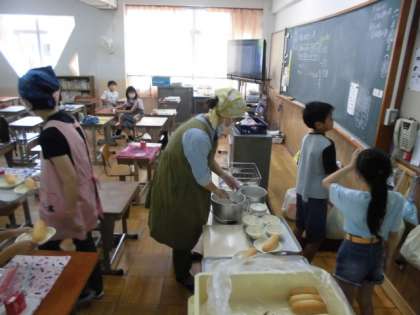 おかずやパン,牛乳を子どもたちの机に置くと,