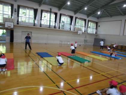 体育館では,2年生がマットあそびをしていました。