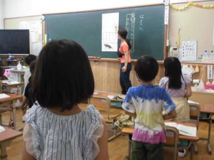 今日は,教科書の文章を先生が読み,「は・を・へ」が出てきたときに