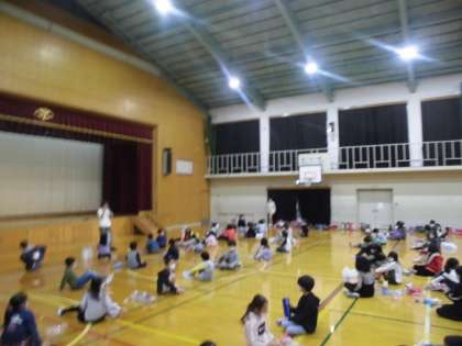 体育館を真っ暗にして,できあがった作品に懐中電灯で