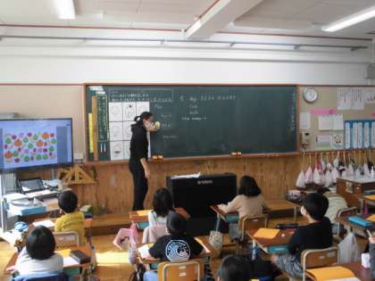 子どもたちは,それぞれ果物や野菜のイラストを切取り