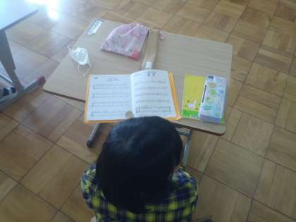 音楽の時間にリコーダーの指使いの練習をしていました。音楽のリズムに合わせ指を動かしていました。今は,新型コロナウイルス感染拡大防止の観点より実際に吹くことが出来ませんが,子ども達は吹いているつもりで一生懸命に練習をしていました。