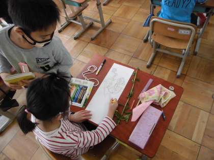 摘んだ花を教室に持ち帰り,画用紙に書きました。