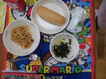 今日は,ミートスパゲッティ,ホウレンソウ,牛乳,パン,りんごゼリーでした。